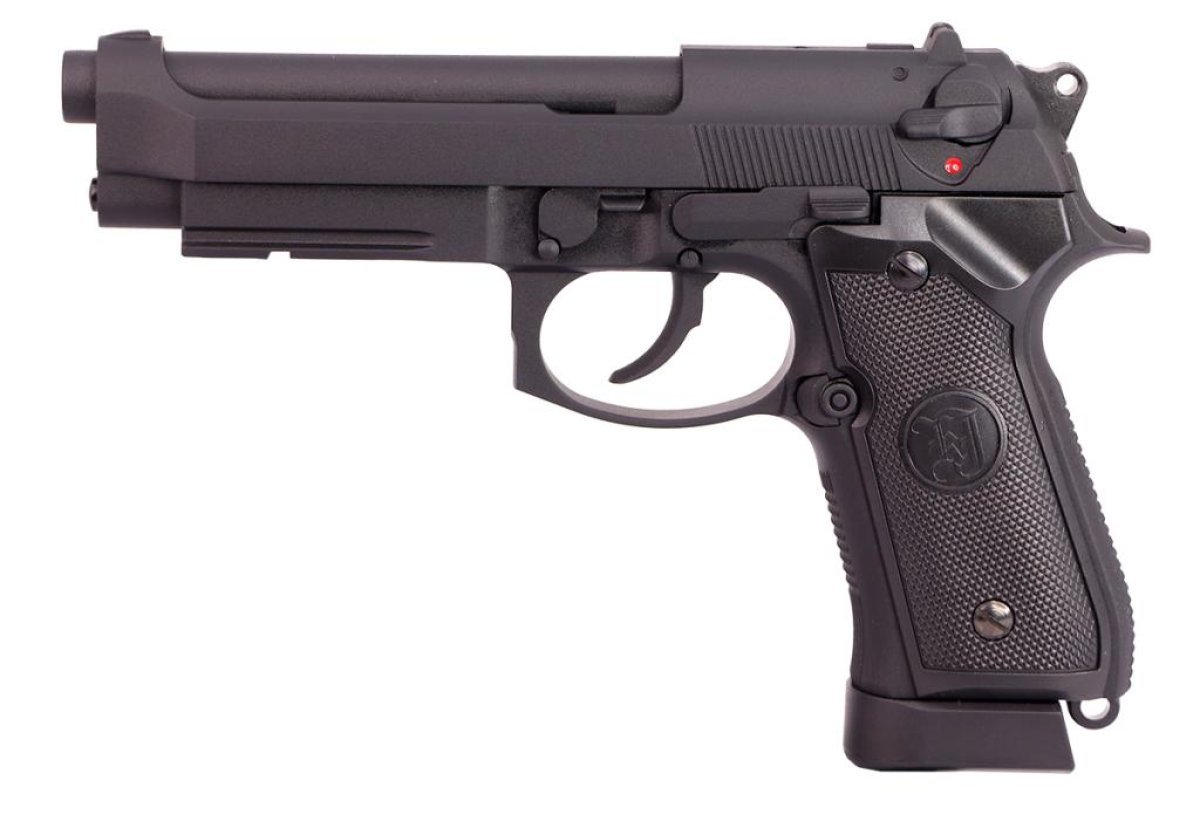 KJW M9 pistola fabricada pela KJ Works é uma réplica do airsoft de uma arma conhecida italiana. Uma réplica foi feita de metal e polímero. É um componente com o seu peso significativo (cerca de 1 kg), porque foi feito praticamente todo o metal - como peças de metal que podem ser usadas no quadro, no slide, na magazine ou no cano. Peças de polímero rígido apenas os painéis de aderência.